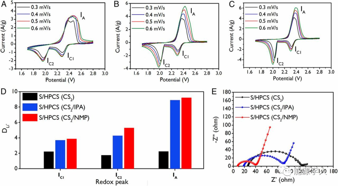 圖3(A)S/HPCS(CS2),(B)S/HPCS(CS2/IPA)和(C)S/HPCS(CS2/NMP)正極的CV圖。(D)每個正極和負極反應的鋰離子相對擴散速率。(E) S/HPCS(CS2)、S/HPCS(CS2/IPA)和S/HPCS(CS2/NMP)正極的Nyquist圖。