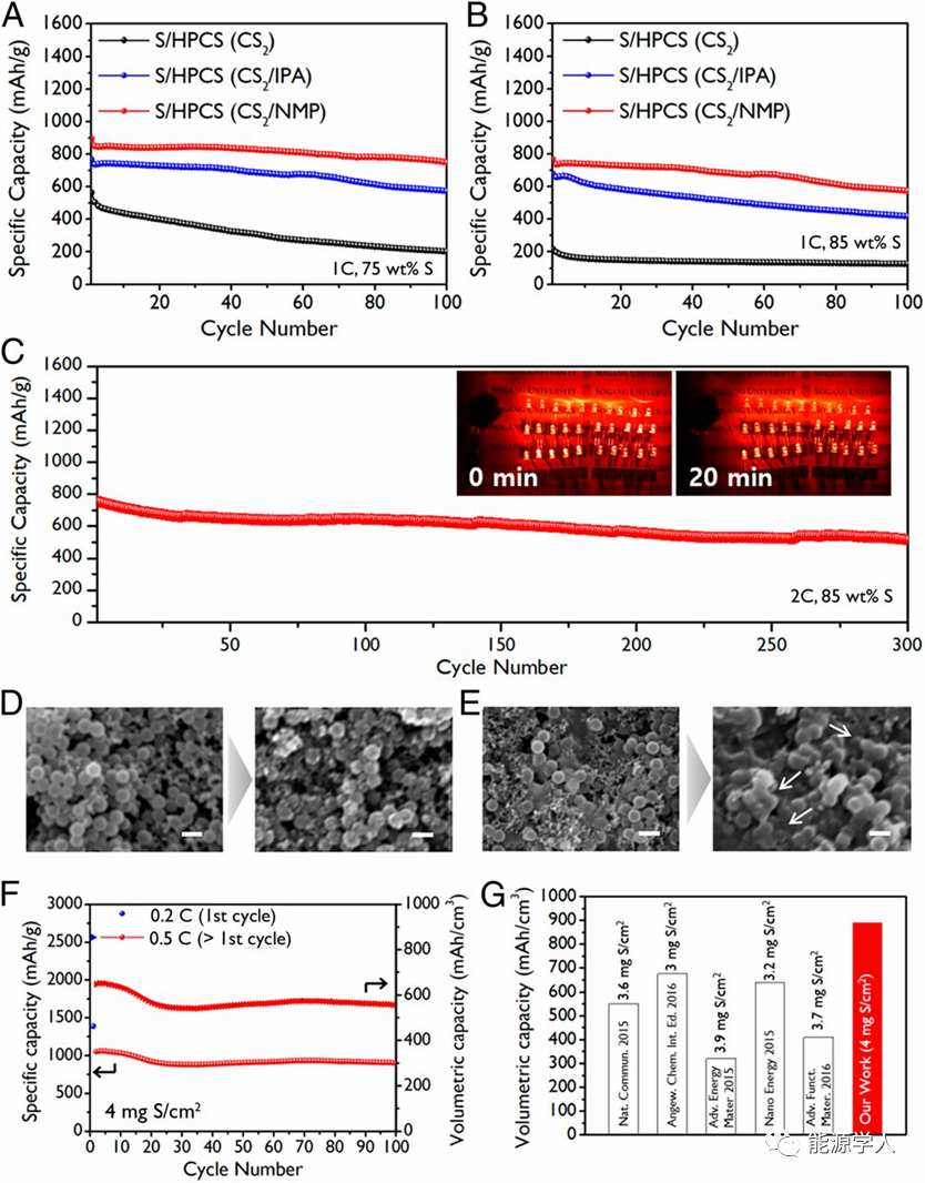 圖5(A和B)S/HPCS(CS2)、S/HPCS(CS2/IPA)和S/HPCS(CS2/NMP)電池的循環性能。(C)硫含量為85%的S/HPCS(CS2/NMP)電池在2 C下的循環性能。(D)S/H-PCS(CS2/NMP)電極和(E)S/H-PCS(CS2)電極50次循環前后的SEM圖像。(F)S/HPCS(CS2/NMP)電極在0.5 C下的比容量和容量。(G)實驗結果與使用類似硫負載的最新結果的比較。