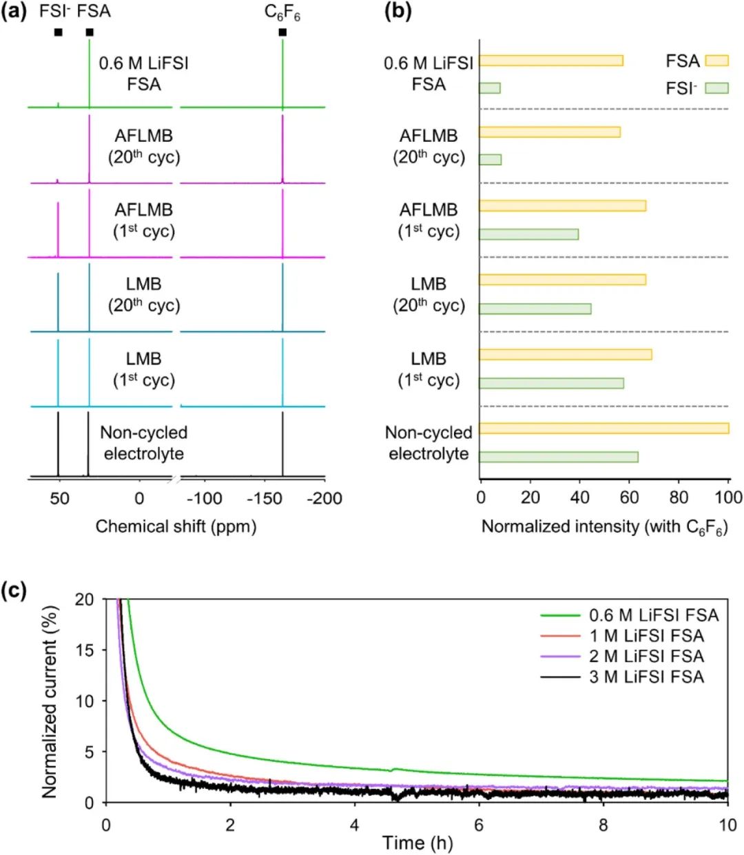 圖3. (a) 0.6 M LiFSI FSA 電解質、非循環電解質、AFLMB 和 LMB 與 3 M LiFSI FSA 電解質經過 1 個和 20 個循環后的 19F NMR 光譜。(b) 19F NMR 光譜中 FSI 陰離子和 FSA 溶劑峰的綜合面積,使用 (a) 19F NMR 光譜中 C6F6 的內部參考進行歸一化。(c) Cu/NCM811 電池在 25 °C預循環后,在 4.25 V 下進行的電化學浮動測試。