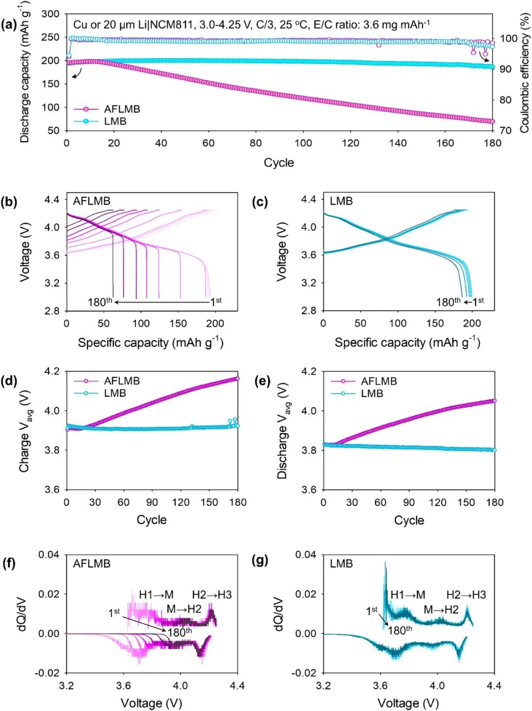 圖2. (a) AFLMB 和 LMB 在紐扣電池中的循環穩定性。使用 3 M LiFSI FSA 電解質的 AFLMB 和 LMB 在循環過程中(b)的電壓曲線。AFLMB 和 LMB (d) 充電和 (e) 放電曲線的平均電壓。(f) AFLMB 和 (g) LMB 超過 180 個循環的 dQ/dV 圖。