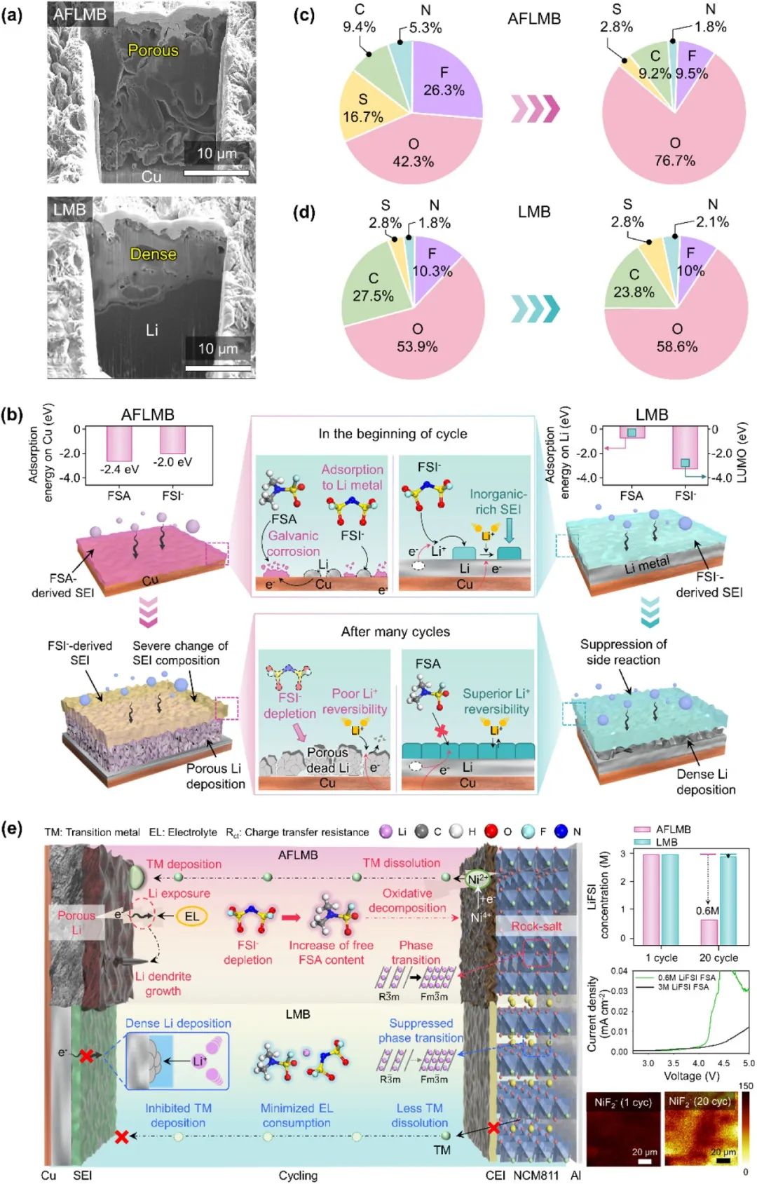 圖1. (a) 銅箔和鋰金屬陽極鍍鋰后的截面 SEM 圖。(b) 根據最低未占分子軌道(LUMO)能級以及 FSA 溶劑和 FSI-陰離子在 Cu 和鋰金屬上的吸附傾向的結果,Cu 銅箔和鋰金屬陽極在第一個周期鍍鋰前后 SEI 成分的變化示意圖。XPS 分析得出的原子百分比:(c) AFLMB 中的銅箔和 (d) LMB 中的鋰金屬陽極,在 AFLMB 首次充電期間,鍍鋰前充電至 3.7 V 和鍍鋰后充電至 4.25 V 時的對比。(e)通過比較分析(循環過程中 LiFSI 濃度的變化、LSV 和 TOF-SIMS 圖像)發現,使用 3 M LiFSI FSA 電解液的 AFLMB 和 LMB 的界面現象存在差異。
