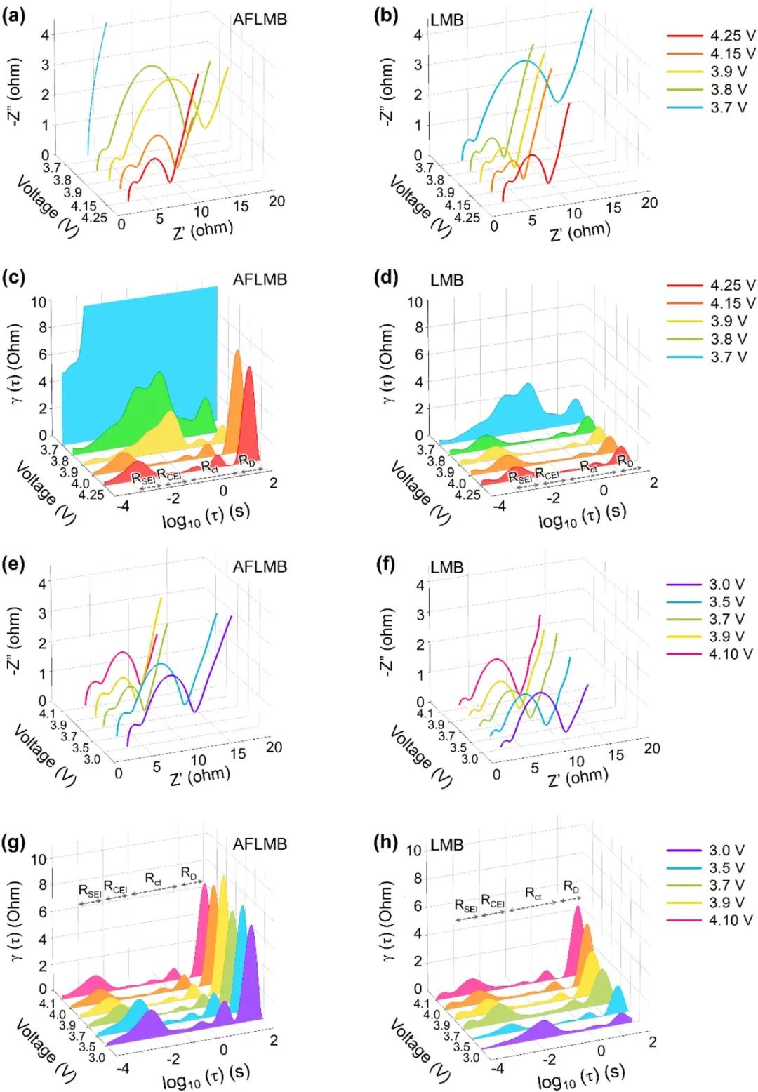 圖6. 不同充電電壓下 (a) AFLMB 和 (b) LMB 的奈奎斯特圖。根據(c) AFLMB 和 (d) LMB 在預循環充電期間的奈奎斯特圖轉換的 DRT 曲線。不同放電電壓下 (e) AFLMB 和 (f) LMB 的奈奎斯特圖。根據預循環放電過程中 (g) AFLMB 和 (h) LMB 的奈奎斯特圖轉換的 DRT 曲線。
