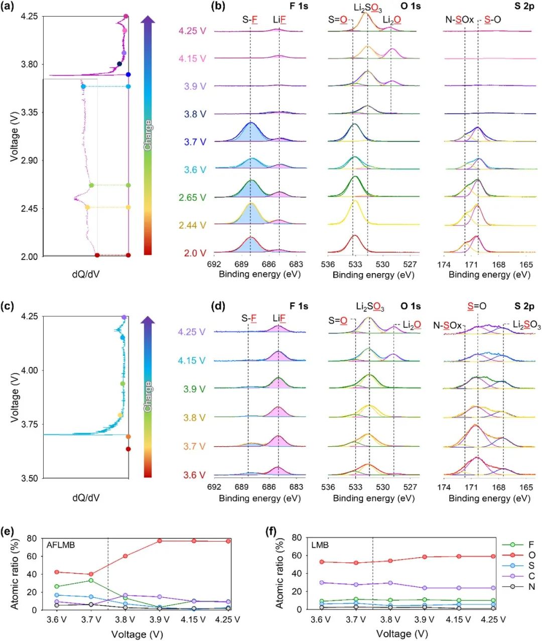 圖4. (a) C/10 預循環充電期間 AFLMB 的 dQ/dV 圖。插圖表示與 SEI 形成相對應的 dQ/dV 峰放大區域。(b) AFLMB 中的銅箔在不同帶電狀態下的 F 1s、O 1s 和 S 2p XPS 結果。(c) C/10 預循環充電期間 LMB 的 dQ/dV 曲線。(d) LMB 中的鋰金屬陽極在不同充電狀態下的 F 1s、O 1s 和 S 2p XPS 結果。XPS 分析得出的 (e) 從 AFLMB 中提取的銅箔和 (f) 從 LMB 中提取的鋰金屬陽極在不同帶電狀態下的界面層原子比。