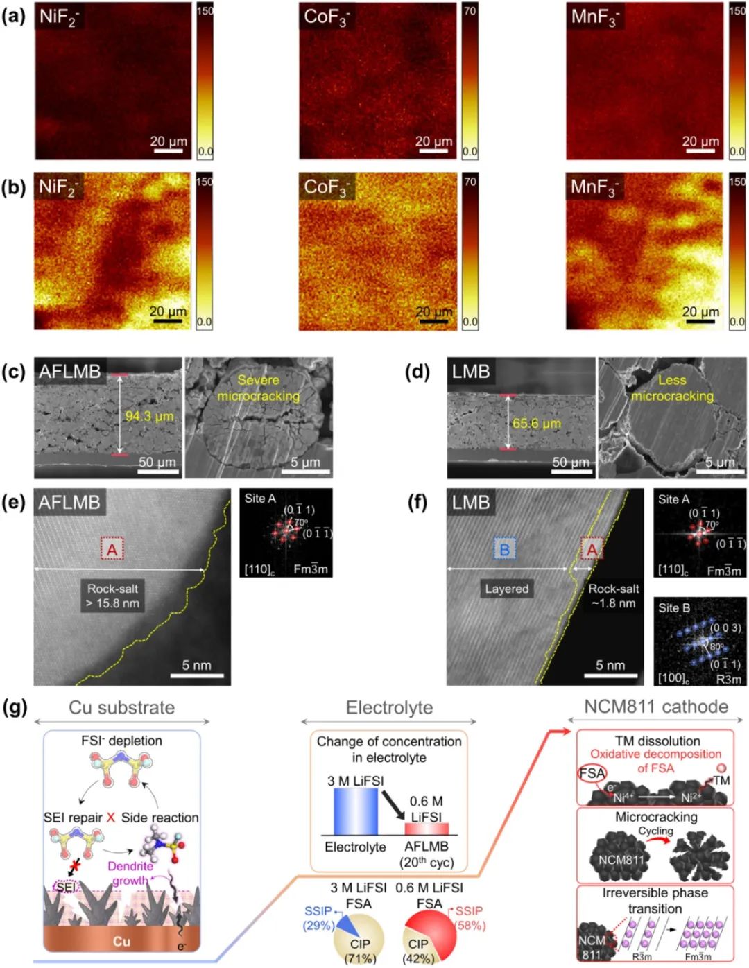 圖7. 在 C/3 和 25 ℃ 下分別經過 (a) 20 次和 (b) 100 次循環后,AFLMB 中銅上的 NiF2-、CoF3- 和 MnF3-的 TOF-SIMS 化學圖譜。在 C/3 和 25 °C 下循環 100 次后,從 (c) AFLMB 和 (d) LMB 中提取的 NCM811 陰極的截面 SEM 圖像。在 C/3 和 25 °C 下循環 100 次后,從含有 3 M LiFSI FSA 電解液的 (e) AFLMB 和 (f) LMB 中提取的 NCM811 陰極的 STEM 圖像和 FFT 圖樣。(g) FSI 陰離子耗竭和 SEI 降解對 NCM811 陰極的交叉影響。