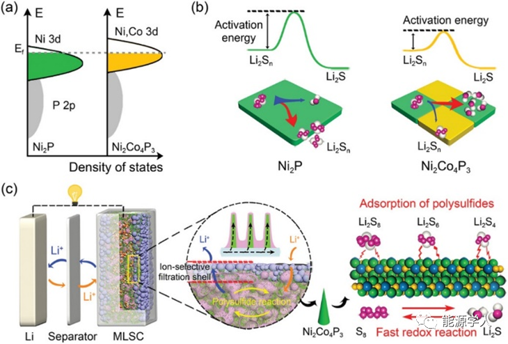 綜上,通過引入氮空位缺陷,能夠調控催化劑的電子結構,從而改善對多硫化物的吸附與催化性能。通過變溫CV測試,結合阿倫尼烏斯方程,引入氮空位后的多硫化物轉化能壘僅為8.11 kJ mol–1,小于Ni3N的21.11 kJ mol–1。基于該催化劑設計,在1000圈的長循環過程中,容量衰減僅為每圈0.039%,即使在5.2 mg cm–2的高負載下,依然可以穩定循環100圈。該文章結合實驗與理論計算,揭示了催化劑電子結構與吸附和催化性能之間的內在聯系,對于進一步設計高活性鋰硫催化劑具有重要的意義。 Zihan Shen, Zili Zhang, Matthew Li, Yifei Yuan, Yue Zhao, Shuo Zhang, Chenglin Zhong, Jia Zhu, Jun Lu*, and Huigang Zhang*, Rational design of a Ni3N0.85 electrocatalyst to accelerate polysulfide conversion in lithium-sulfur batteries, ACS nano, 2020, DOI:10.1021/acsnano.9b09371Zihan Shen, Mengqiu Cao, Zili Zhang, Jun Pu, Chenglin Zhong, Jiachen Li, Haixia Ma, Fujun Li, Jia Zhu, Feng Pan, Huigang Zhang, Efficient Ni2Co4P3 Nanowires Catalysts Enhance Ultrahigh‐Loading Lithium–Sulfur Conversion in a Microreactor‐Like Battery, Advanced Functional Materials, 2019, 30(3), 1906661 , DOI: 10.1002/adfm.201906661