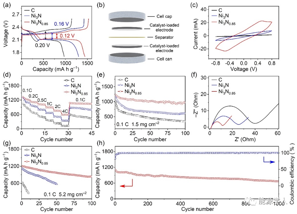 電化學性能表征如圖6所示,以0.02 C倍率充放電,添加Ni3N0.85催化劑的極化電壓僅為0.12 V,在1.5 mg cm–2負載量下,循環1000圈后的比容量保持在669.4 mAh g–1,容量衰減僅為每圈0.039%。即使在5.2 mg cm–2負載量下,依然可以穩定循環100圈。