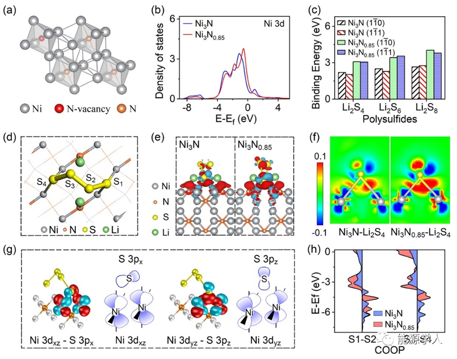 為了在分子層面上揭示氮空位引入后的催化特性,如圖4所示,第一性原理計算表明,引入氮空位后,金屬Ni的3d軌道向費米能級方向移動,增強了多硫化物的吸附性能。差分電荷密度顯示出金屬Ni原子與多硫化物中的S原子之間存在較強的電荷轉移。作者進一步通過Wannier計算,表明該電荷轉移主要是由于金屬Ni的3dxz,3dyz軌道分別與端基S的3px,3pz軌道重疊,電子從金屬Ni的3d軌道上轉移并填充到端基S原子的LUMO軌道上,使得端基S-S鍵的反鍵態增加,從而弱化了S-S鍵,催化了多硫化物轉化。
