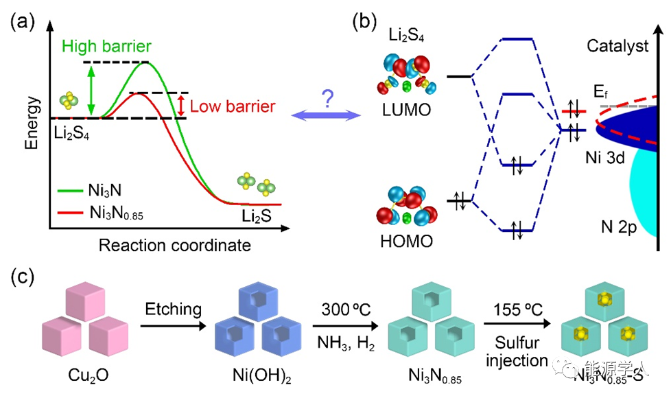 圖2. 氮空位缺陷降低多硫化物轉化能壘以及Ni3N0.85制備流程示意圖